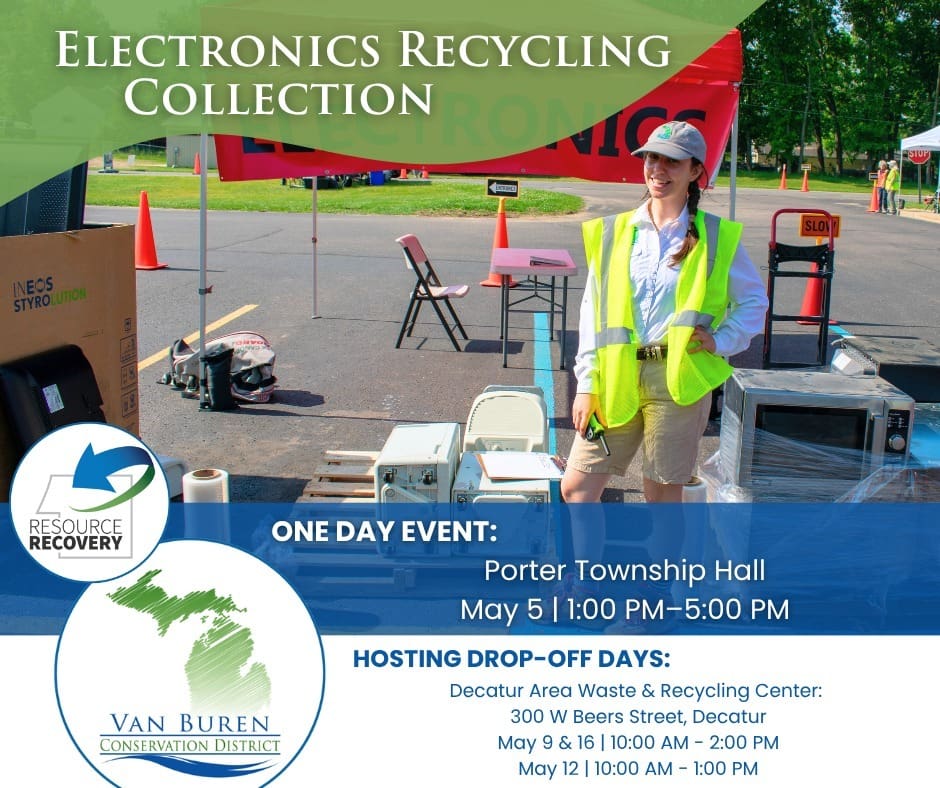 The Van Buren Conservation District’s Resource Recovery program is hosting electronics recycling drop-off opportunities this May. Bring your old electronics to any of the following events: